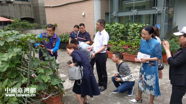 “隨手環(huán)保,財源穩(wěn)!、“綠色大地,生命永續(xù)”、“紙張勿浪費,綠樹誠可貴”……臺北市中山區(qū)劍潭里社區(qū)服務(wù)中心大樓的每一級階梯,都貼著這樣的環(huán)保小格言。在這里,參訪團一行參觀了太陽能板、中水回收系統(tǒng)、市民農(nóng)園、節(jié)能燈具汰換等低碳設(shè)施并在生態(tài)小院澆灌生態(tài)小黃瓜并采摘品嘗。