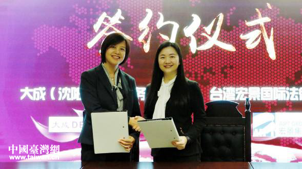 中國臺灣網(wǎng)5月29日沈陽訊 日前,為進一步打造沈陽國際化營商環(huán)境,促進沈臺兩地法律界的交流合作,服務在沈臺商發(fā)展,經(jīng)市臺辦溝通協(xié)調,臺灣宏景國際法律事務所所長鄒純忻女士和北京大成律師事務所沈陽分所副主任李盾女士,分別代表兩家律師事務所在沈簽署戰(zhàn)略合作協(xié)議。沈陽市臺辦副主任朱軍和沈陽市仲裁辦副主任張進出席簽約儀式。