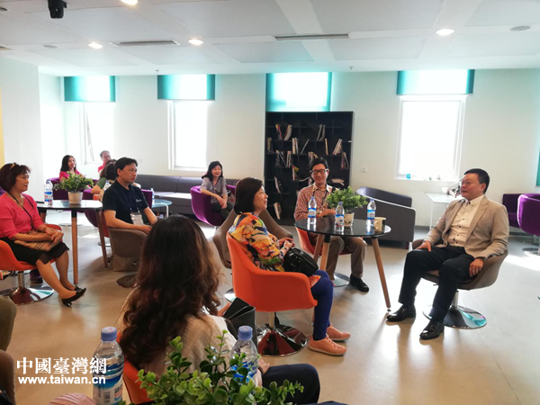 成都臺協(xié)常務(wù)副會長暨青委會主任張榮華向參訪團介紹德陽青創(chuàng)園相關(guān)情況。(圖片來源:四川省臺聯(lián))