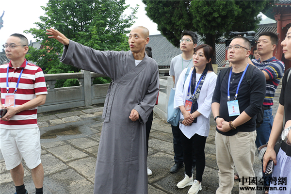 兩岸媒體記者聆聽法師講述四祖寺的禪宗淵源。(中國臺灣網(wǎng) 郜利敏 攝)