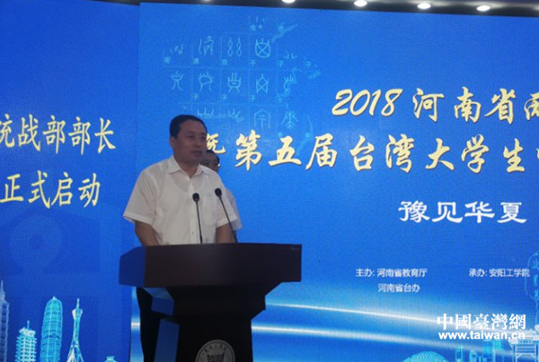 中共河南省委常委、統(tǒng)戰(zhàn)部部長(zhǎng)孫守剛宣布 “2018河南省兩岸青年交流月暨第五屆臺(tái)灣大學(xué)生中原文化之旅”正式啟動(dòng)。(河南省臺(tái)辦供圖)