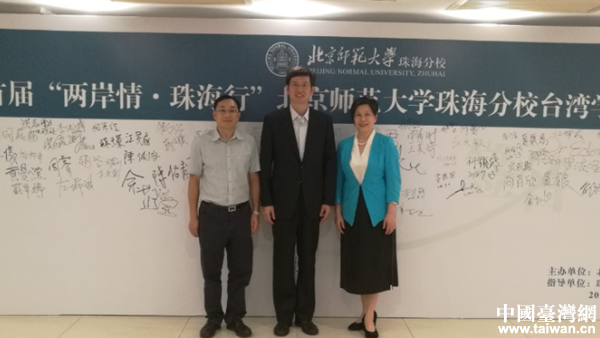 珠海市人民政府臺(tái)灣事務(wù)局局長劉江成、澳門中聯(lián)辦臺(tái)灣事務(wù)部部長徐莽和北師大珠海分校常務(wù)副校長傅愛蘭合影。(圖片來源:珠海市臺(tái)灣事務(wù)局)