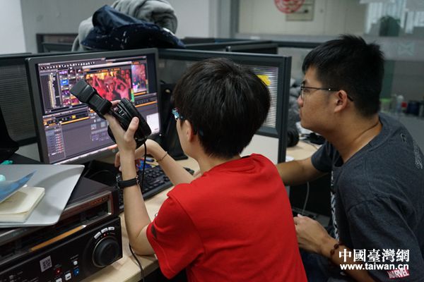 陳韻璇和王整維正在機(jī)房剪片子。(余林釵攝)