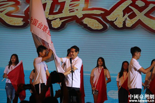 全國(guó)臺(tái)聯(lián)黨組書記、會(huì)長(zhǎng)黃志賢授夏令營(yíng)總營(yíng)旗。(全國(guó)臺(tái)聯(lián) 易靖茗 攝)