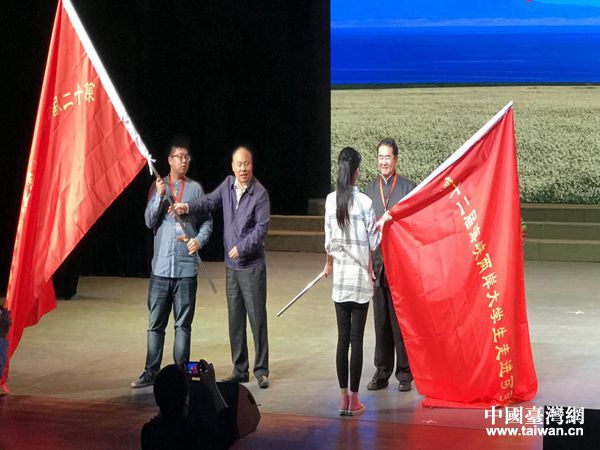 楊逢春副省長(zhǎng)和臺(tái)灣退役將領(lǐng)夏瀛洲向兩岸大學(xué)生代表授旗。(圖片來源:青海省臺(tái)辦)