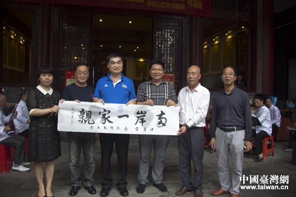 在吉安市臺辦主任劉云峰、副主任吳孝明、江西廬陵人文谷旅游集團(tuán)董事長陳萬洵的陪同下,鄧家基一行到吉安廬陵老街參訪,廬陵老街藝術(shù)家向鄧家基贈送了《兩岸一家親》書法作品,祝愿兩岸同胞一家親。