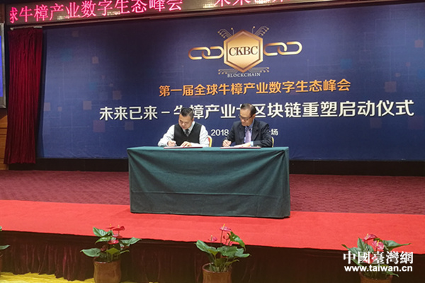 全球牛樟芝區(qū)塊鏈產(chǎn)業(yè)聯(lián)盟與福建老深山農(nóng)業(yè)科技有限公司簽訂第一筆價(jià)值1億元的牛樟芝產(chǎn)品訂單。(中國臺(tái)灣網(wǎng) 郜利敏 攝)