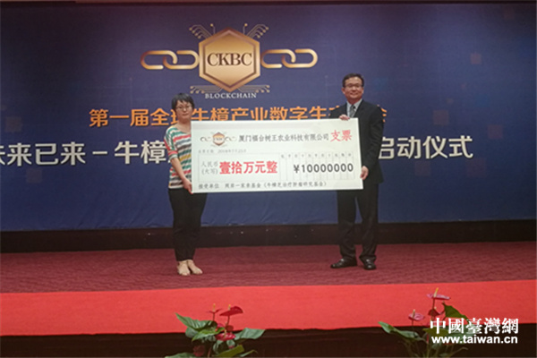 全球牛樟芝區(qū)塊鏈產(chǎn)業(yè)聯(lián)盟向中國社會(huì)福利基金會(huì)兩岸一家親基金捐贈(zèng)10萬元。(中國臺(tái)灣網(wǎng) 郜利敏 攝)