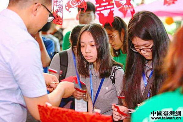 活動開始后,在專區(qū)負(fù)責(zé)人的講解與指導(dǎo)下,臺灣同學(xué)們爭相體驗包含著華夏先哲無窮智慧、極具特色又充滿趣味的傳統(tǒng)文化項目。尤其是剪紙、中國結(jié)和武術(shù)太極,吸引了大批青年。當(dāng)一張張喜字剪紙、一個個中國結(jié)呈現(xiàn)在他們手中,當(dāng)太極的招式被有板有眼地模仿出來時,成功的喜悅以及對傳統(tǒng)文化的深刻印象永遠(yuǎn)地保存在他們的記憶里。
