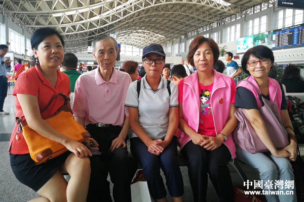 王英和成都臺(tái)協(xié)婦聯(lián)會(huì)工作人員與劉震國(guó)(左二)在成都雙流機(jī)場(chǎng)合影。(圖片來(lái)源:綿陽(yáng)市臺(tái)辦)