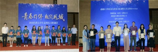 儀式上播放了“青春作伴 相約鳳城”精彩時光紀錄片以及同學們精心制作的微視頻作品。臺灣同學們用手機、相機和文字記錄下了在實習參訪過程中所見到的身邊人、身邊事以及美景,特別是學習京劇的精彩瞬間、過生日的感動畫面、工作實習的成果等等,用臺生專屬的視角表達了對美麗江蘇和幸福泰州的贊許。在剛剛結束的“我眼中的江蘇”隨手拍和主題征文大賽活動中,泰州市臺辦選送的作品,從全省臺灣大學生1214張攝影作品、86段短視頻以及102篇美文產(chǎn)生的46個獎項中脫穎而出,取得了優(yōu)異的成績,獲得了省臺辦領導和兩岸大學生的一致肯定。