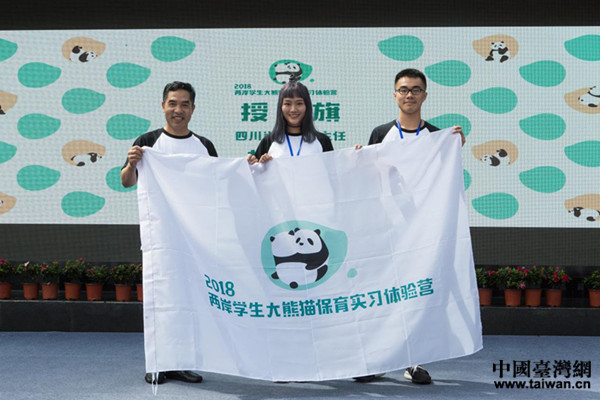 四川省臺辦副主任趙宇(左一)授營旗。(圖片來源:四川省臺辦)
