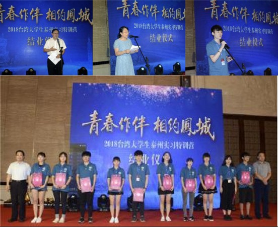 2018臺灣大學(xué)生泰州實習(xí)特訓(xùn)營結(jié)營儀式上,領(lǐng)導(dǎo)和代表學(xué)生講話并合影留念。(圖片來源:泰州市臺辦)