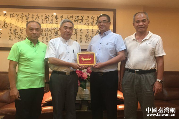 廣州市臺聯(lián)會長葉耀華(右二)與臺北市體育教育交流協(xié)會代表交換紀念品。(圖片來源:廣州市臺聯(lián))