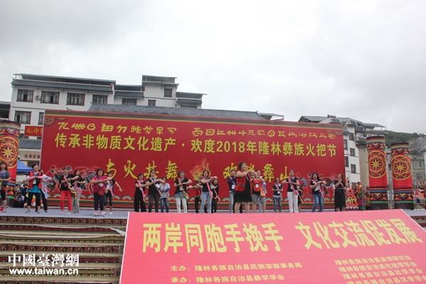 5日下午,參訪團一行參加隆林彝族火把節(jié)文藝聯(lián)歡及民俗表演活動。以“兩岸同胞手拉手、文化交流促發(fā)展”為主題的文藝演出在歡快的彝族歌舞《俄迷吉奪咧》中拉開序幕,以富有隆林民族特色的節(jié)目,向臺灣同胞展現(xiàn)了隆林特有的民族風(fēng)情。臺灣同胞帶來的歌舞《我們都是一家人》節(jié)目,將文藝演出推向了高潮,不一樣的舞姿,不同的音樂,洋溢著同一種歡樂。臺灣同胞還參與到充滿彝族特色的打磨秋、搶鴨蛋、搶姑娘、抹黑臉等民俗表演活動中,體驗彝族火把節(jié)的濃厚趣味。在德峨鎮(zhèn),參訪團還到居民家中與居民面對面交流,當(dāng)?shù)鼐用衲贸鲎葬劦臈蠲肪频扰c臺灣朋友共享,賓主盡歡認兄弟。不少團同表示,來到這里就像到兄弟的家,希望下次有機會再來參加火把節(jié),再拜訪自己的兄弟。