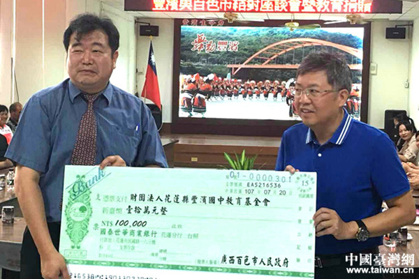 參訪團(tuán)向豐濱鄉(xiāng)捐贈(zèng)教育基金。(圖片來源:廣西百色市臺(tái)辦)