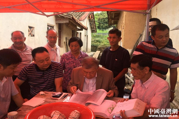 邱鏡淳與蕉嶺宗親對照族譜,了解淵源。(圖片來源:梅州市臺辦)