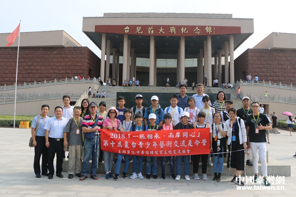 第十屆棗臺青少年藝術交流夏令營參與人員在臺兒莊大戰(zhàn)紀念館合影留念。(圖片來源:棗莊市臺辦)