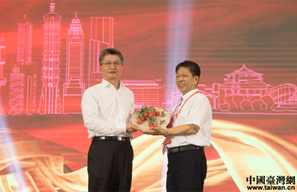 曾衛(wèi)東主任向市臺(tái)協(xié)增城分會(huì)贈(zèng)送紀(jì)念品。(圖片來源:廣州市增城區(qū)臺(tái)辦)