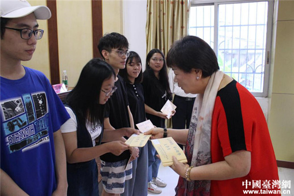 中杰公司劉何玉鈴向?qū)W生發(fā)放助學(xué)金。(圖片來(lái)源:肇慶市臺(tái)辦)