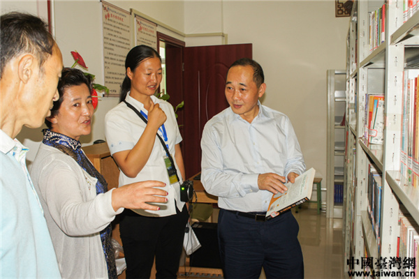 在瀘定縣貢嘎山小學(xué)考察臺資企業(yè)頂新集團(tuán)捐建的圖書室。(圖片來源:四川省臺辦)