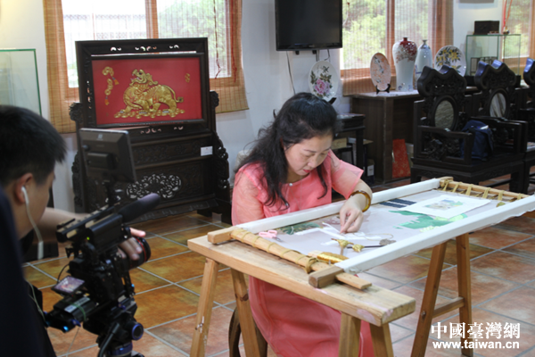 非遺項目抽紗、潮繡、珠鄉(xiāng)傳承人洪靜,F(xiàn)場演示高超技藝。(圖片來源:汕頭市臺辦宣傳交流科)