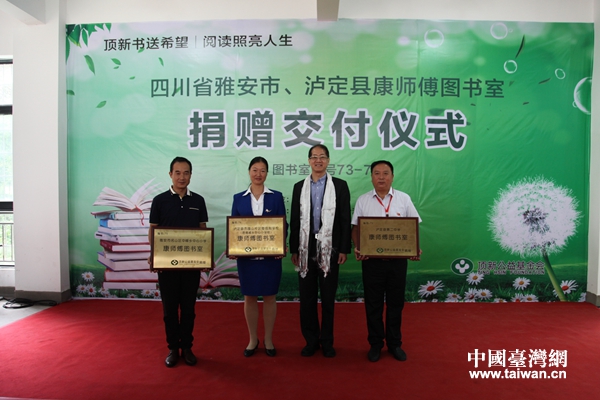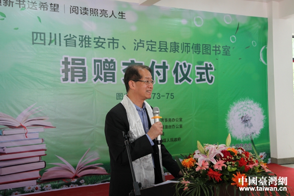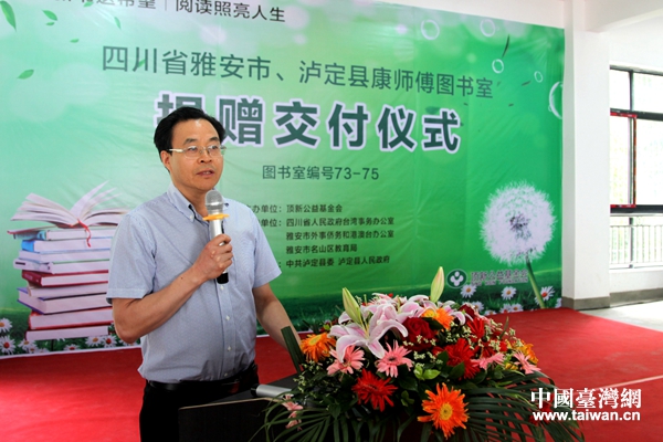 頂新公益基金會理事長滕鴻年在“康師傅圖書室”交付儀式上致辭。(圖片來源:四川省臺辦)