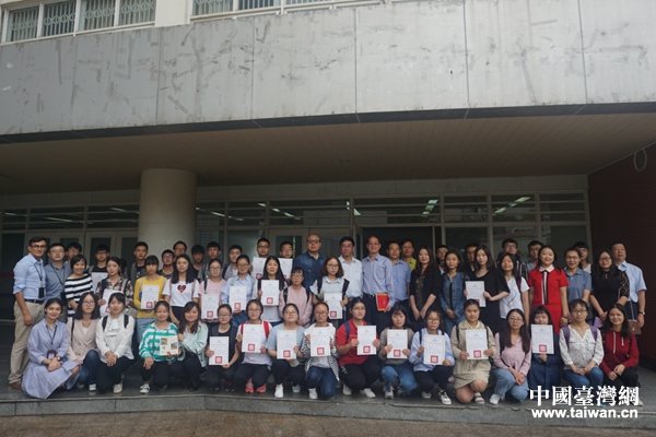 滕鴻年、張軍一行與受助四川大學(xué)學(xué)生合影留念。(圖片來源:四川省臺辦)