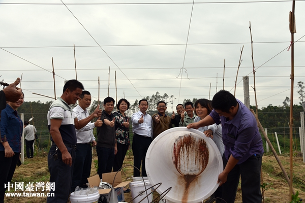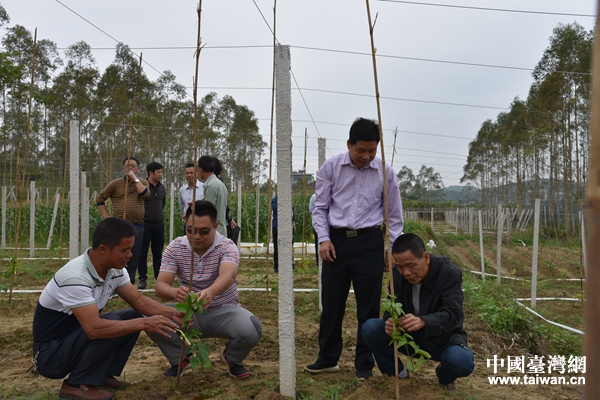 中國臺灣網10月18日玉林訊 10月12日,在第5個扶貧日即將到來之際,廣西省玉林市臺辦、臺協(xié)代表到貧困村博白縣松旺鎮(zhèn)周北村集中開展扶貧日系列幫扶活動。察看扶貧產業(yè)項目——百香果的幼苗長勢,送去綁枝機、夾藤器等一批種植百香果所需的工具及肥料。