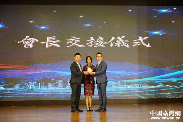 在佛山市委臺(tái)辦主任香秀杏(中)的見(jiàn)證下,詹正興(右一)從第二屆會(huì)長(zhǎng)劉偉立(左一)手中接過(guò)會(huì)長(zhǎng)印鑒。(圖片來(lái)源:佛山市臺(tái)辦)