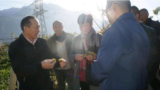 羅治平主任(左一)和四川農(nóng)業(yè)大學(xué)龔國(guó)淑教授(左三)在海子村獼猴桃基地了解種植情況。(來(lái)源:四川省臺(tái)辦)