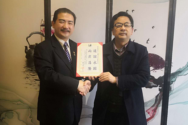 林均霖(左)向南充市臺(tái)辦主任唐恒金(右)贈(zèng)送交流狀。(圖片來(lái)源:南充市臺(tái)辦)