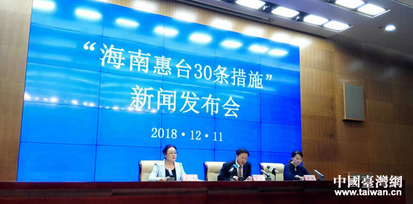 中國臺灣網(wǎng)12月11日?谟 12月11日,在“海南惠臺30條措施”新聞發(fā)布會上,海南省發(fā)布了《中共海南省委統(tǒng)一戰(zhàn)線工作部 海南省發(fā)展和改革委員會 貫徹落實〈關(guān)于促進兩岸經(jīng)濟文化交流合作的若干措施〉實施意見》(簡稱“海南30條惠臺措施”)!昂D30條惠臺措施”的出臺旨在深入貫徹黨的十九大精神和習(xí)近平總書記關(guān)于對臺工作重要論述,與臺灣同胞分享建設(shè)中國(海南)自由貿(mào)易試驗區(qū)、中國特色自由貿(mào)易港發(fā)展機遇,讓臺灣同胞在海南投資、創(chuàng)業(yè)、就業(yè)、學(xué)習(xí)和生活有更多的獲得感。