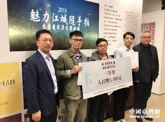 一等獎(jiǎng)由曹子育(左2)、宋修宇(中)、戴有良(右2)為代表領(lǐng)獎(jiǎng),由武漢海峽兩岸交流促進(jìn)會(huì)劉紅鳴會(huì)長(右1)與張強(qiáng)副會(huì)長(左1)共同頒發(fā)獎(jiǎng)狀與獎(jiǎng)金。(圖片來源:武漢市臺(tái)辦)