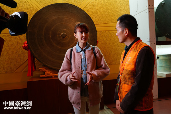 在“銅鼓之王”前采訪。(圖片來源:廣西南寧市臺辦)
