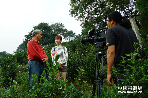 采訪橫縣茶廠老廠長黃錦河。(圖片來源:廣西南寧市臺辦)