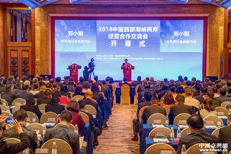 “中國(guó)西部海峽兩岸經(jīng)貿(mào)合作交流會(huì)”始于1998年,從2013年開始每年連續(xù)舉辦,已成為兩岸經(jīng)貿(mào)交流合作的知名品牌。圖為2018年10月17日舉行的“2018中國(guó)西部海峽兩岸經(jīng)貿(mào)合作交流會(huì)”開幕式現(xiàn)場(chǎng)。(圖片來(lái)源:四川省臺(tái)辦)
