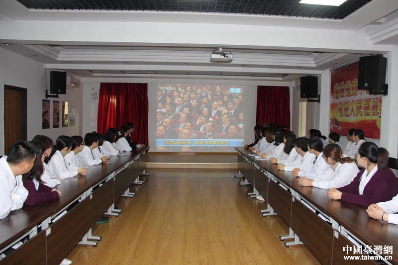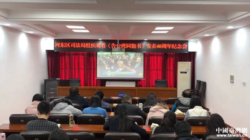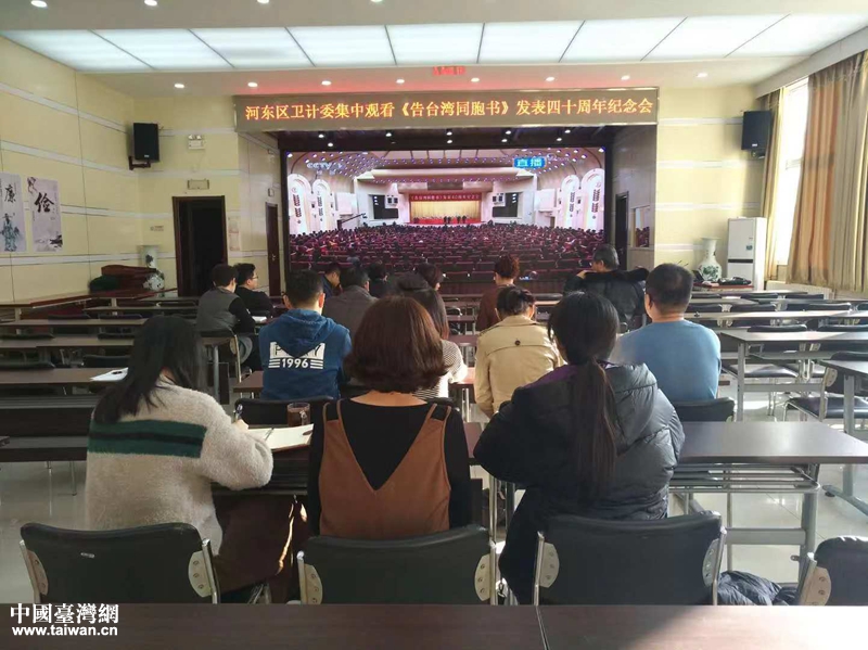 天津市河?xùn)|區(qū)各界集中收看《告臺(tái)灣同胞書》發(fā)表四十周年紀(jì)念會(huì)。(圖片來(lái)源:天津市臺(tái)辦)