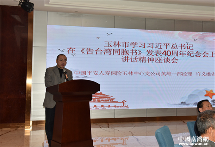 臺(tái)胞許義雄在玉林市學(xué)習(xí)習(xí)近平總書記在《告臺(tái)灣同胞書》發(fā)表40周年紀(jì)念會(huì)上的重要講話精神座談會(huì)上發(fā)言。(圖片來(lái)源:玉林臺(tái)辦)