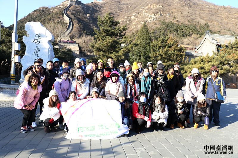 2019年臺(tái)胞青年冬令營(yíng)22日開營(yíng)。營(yíng)員們?cè)诰佑龟P(guān)長(zhǎng)城合影留念。(中國(guó)臺(tái)灣網(wǎng) 郜利敏 攝)