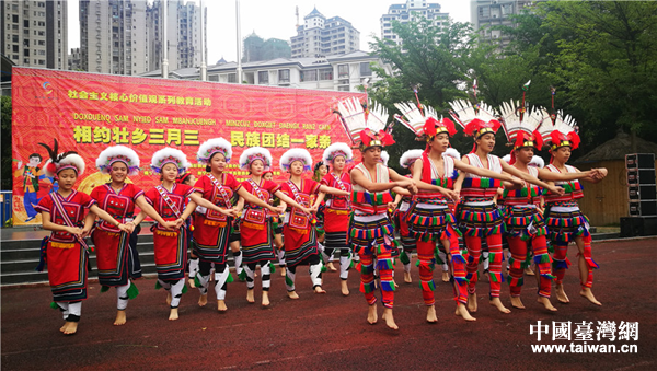 2018年4月16日,桂臺(tái)各民族連續(xù)第三年歡度“壯族三月三”期間,臺(tái)灣花蓮縣化仁中學(xué)學(xué)生在廣西南寧市桂雅路小學(xué)表演《阿美人豐年祭》。(圖片來(lái)源:廣西臺(tái)辦)