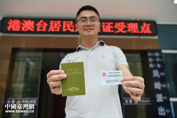 2018年9月1日,南寧市臺(tái)灣同胞投資企業(yè)協(xié)會(huì)會(huì)長(zhǎng)周代祥在南寧領(lǐng)到全國(guó)第一張臺(tái)灣居民居住證。(圖片來(lái)源:廣西臺(tái)辦)