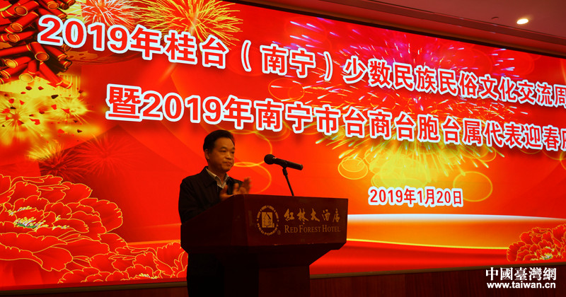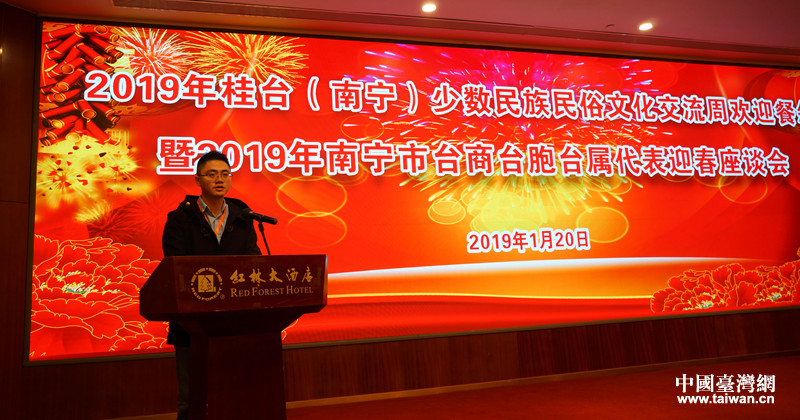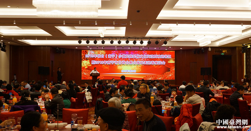 中國(guó)臺(tái)灣網(wǎng)1月29日南寧訊 1月20日,廣西南寧市舉辦臺(tái)商臺(tái)屬代表迎春座談會(huì),南寧市14個(gè)相關(guān)部門(mén)與南寧市臺(tái)商臺(tái)胞臺(tái)屬代表,與參加2019年桂臺(tái)(南寧)少數(shù)民族民俗文化交流周的臺(tái)灣嘉賓歡聚一堂,共敘同胞友誼,共話親情友情。廣西臺(tái)辦副主任李文,南寧市委常委、統(tǒng)戰(zhàn)部長(zhǎng)趙紅明出席并致辭。
