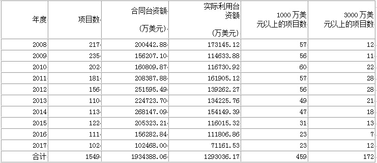 經(jīng)過山東省方方面面的共同努力,山東對臺經(jīng)貿(mào)交流合作邁入融合推進的新階段,魯臺經(jīng)貿(mào)合作不斷深化,規(guī)模持續(xù)擴大、領(lǐng)域不斷拓展、質(zhì)量穩(wěn)步提升,2008年-2017年山東省批準臺資項目1549個,合同臺資193.4億美元,實際利用臺資129.3億美元,臺資項目質(zhì)量明顯提高,大項目增多,截至2017年底,山東省總投資1000萬美元以上的臺資項目共1057個,其中總投資額在3000萬美元以上項目210個。