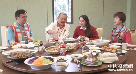 著名滇菜大師楔煒(左二)介紹云南美食。(圖片來源:云南省臺(tái)辦宣傳處)