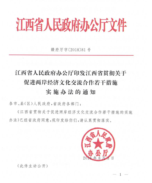 2、江西省臺辦積極推動“惠臺31條”落地生效。于8月8日正式發(fā)布《江西省貫徹關于促進兩岸經濟文化交流合作若干措施的實施辦法》(簡稱“江西惠臺60條”)。
