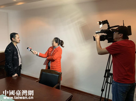 在疆常住臺胞陳文雄接受新疆電視臺采訪。(圖片來源:新疆臺辦)