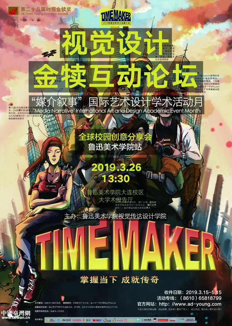 中國臺灣網(wǎng)4月1日大連訊 3月26日,“Time Maker—掌握當(dāng)下,成就傳奇”——時報世界華文創(chuàng)意大會、第二十八屆時報金犢獎全球校園創(chuàng)意分享會在魯迅美術(shù)學(xué)院大連校區(qū)一號學(xué)術(shù)報告廳舉辦。分享會上,金犢獎組委會代表、旺旺中時文化傳媒總監(jiān)林洛安先生為魯迅美術(shù)學(xué)院頒發(fā)感謝狀。創(chuàng)意分享嘉賓李三水老師向各高校教師代表頒發(fā)了榮譽聘書,并結(jié)合案例為師生們開展了一次“不做創(chuàng)意人,只做創(chuàng)造者”的主題演講。