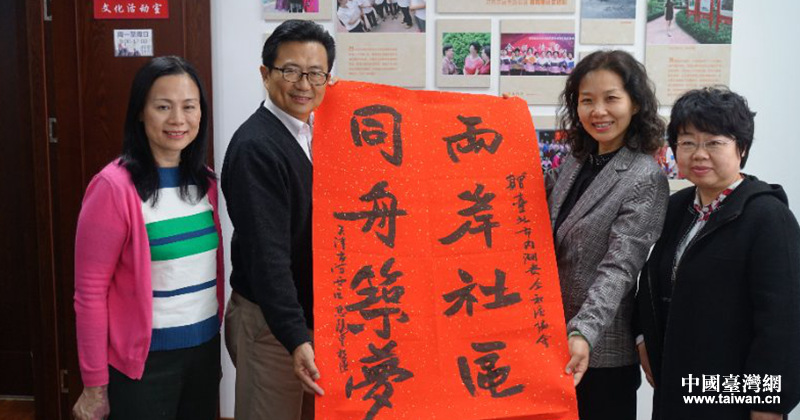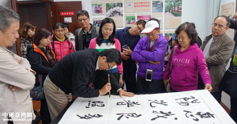 訪問團(tuán)在欣賞社區(qū)文藝隊(duì)精心準(zhǔn)備的詩(shī)朗誦《讀中國(guó)》、二重唱《外婆的澎湖灣》、民樂齊奏等極具中國(guó)風(fēng)的文藝節(jié)目時(shí),與社區(qū)居民一起聯(lián)歡互動(dòng),感受骨肉親情。在書畫活動(dòng)室,來賓們向剪紙愛好者饒有興致地學(xué)習(xí)剪紙技藝,社區(qū)居民們向遠(yuǎn)道而來的客人贈(zèng)送“!弊旨艏埍磉_(dá)美好祝愿。在書法交流活動(dòng)現(xiàn)場(chǎng),社區(qū)書法愛好者書寫“兩岸社區(qū)同舟筑夢(mèng)”“兩岸一家血濃于水”等書法作品贈(zèng)送臺(tái)灣客人,訪問團(tuán)成員、臺(tái)北市議員吳世正先生現(xiàn)場(chǎng)揮毫,題寫“惠我良多陽(yáng)光普照”的藏頭書法作品贈(zèng)與惠陽(yáng)里社區(qū),兩岸同胞心靈契合躍然紙上。