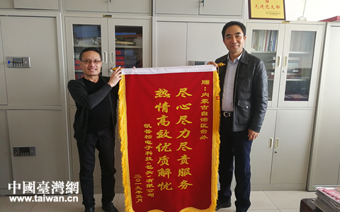 凱普松電子科技(包頭)有限公司總經(jīng)理林鴻儒(左,臺(tái)灣籍)向自治區(qū)臺(tái)辦贈(zèng)送錦旗。(圖片來源:內(nèi)蒙古自治區(qū)臺(tái)辦)